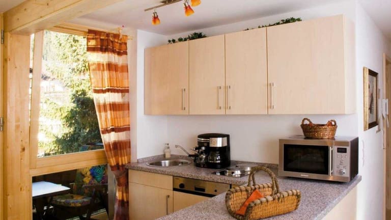 voll ausgestattete Küche mit Geschirrspüler, Bad mit Fußbodenheizung, zusätzliches Schlafsofa im Wohnbereich Schlafzimmer