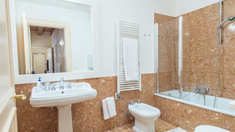 Die Ferienwohnung umfasst ein Schlafzimmer, ein Wohnzimmer mit Sitz- und Essbereich sowie eine Küche, die mit einem Kühlschrank, Geschirrspüler und Ofen ausgestattet ist. Zudem stehen 2 Badezimmer zur Verfügung, die jeweils mit einem Bidet und einer Dusche ausgestattet sind. Handtücher und Bettwäsche werden bereitgestellt.