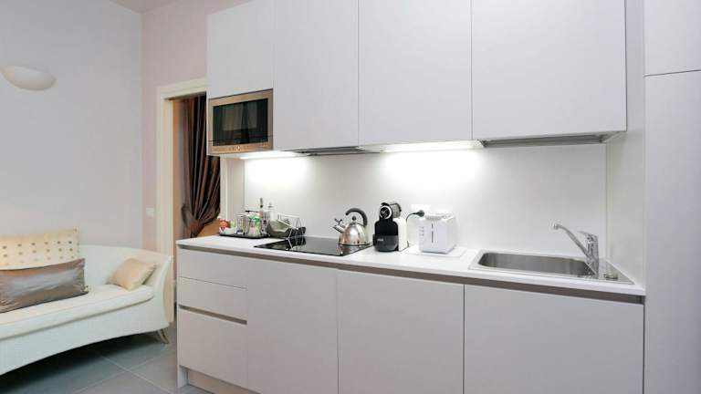 Die Unterkunft ist mit einer Klimaanlage ausgestattet. Die Zimmer verfügen über eine voll ausgestattete Küche mit Essbereich, Flachbild-TV und eigenem Badezimmer, das mit einem Bidet, kostenlosen Pflegeprodukten sowie einem Haartrockner ausgestattet ist. Zur Ausstattung gehören zudem ein Kühlschrank, ein Geschirrspüler, ein Ofen, eine Kaffeemaschine und ein Wasserkocher.