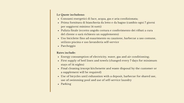 Die Wohneinheiten sind mit einem Schlafsofa, einem Flachbild-TV mit Satellitenkanälen sowie einer gut ausgestatteten Küche ausgestattet. Jedes Zimmer verfügt über ein eigenes Badezimmer mit Bidet und Dusche, einige Zimmer bieten zudem ein voll ausgestattetes Badezimmer mit Badewanne und Haartrockner.