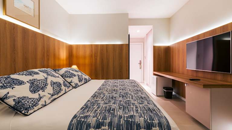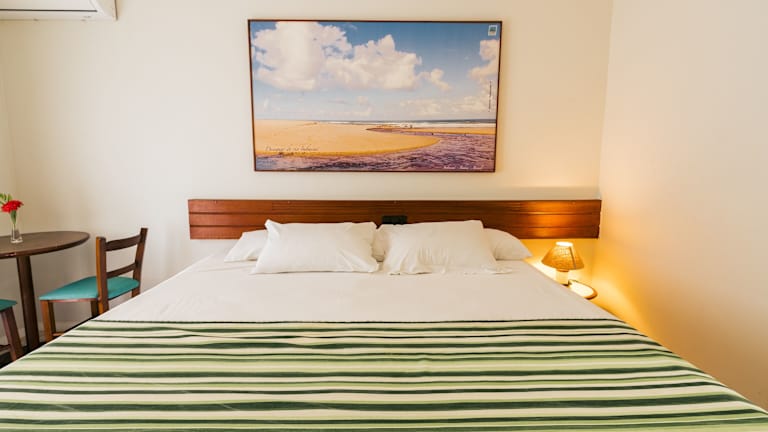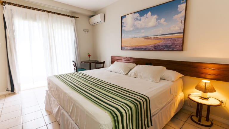 Die Zimmer im Resort Costa Dos Coqueiros bieten eine praktische und komfortable Unterkunft. Mit gefliesten Böden und lebendigen Fischdruck-Bettwäsche vermitteln die Zimmer eine fröhliche Atmosphäre. Alle Zimmer sind klimatisiert und verfügen über einen eigenen Balkon sowie kostenloses WLAN.