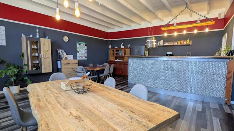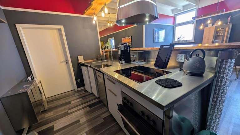 Eine voll ausgestattete Küche mit Kühlschrank und Kaffeemaschine ist vorhanden. Keine Informationen über gastronomische Angebote in der Unterkunft.