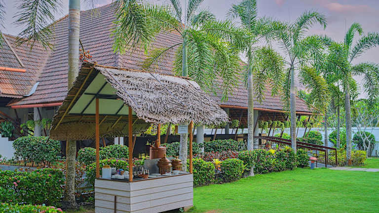 Das Rhythm Kumarakom (ehemals Aveda Resorts) ist ein luxuriöses 5-Sterne-Hotel in Kottayam, das direkt am See gelegen ist. Mit seinen erstklassigen Einrichtungen wie einem Wellnessbereich, einem Außenpool und einem Spielzimmer bietet das Hotel seinen Gästen einen erholsamen und angenehmen Aufenthalt. Genießen Sie regionale Küche in einem der Restaurants oder lassen Sie sich vom Zimmerservice verwöhnen. Das freundliche Personal, der kostenfreie Parkservice und das kostenlose WLAN runden das Angebot ab.