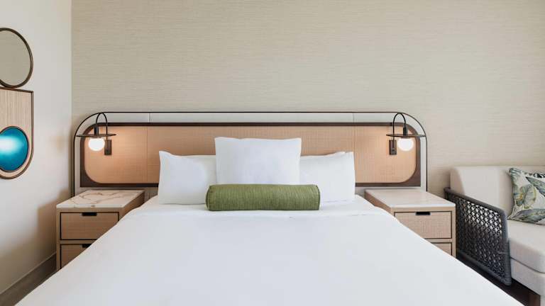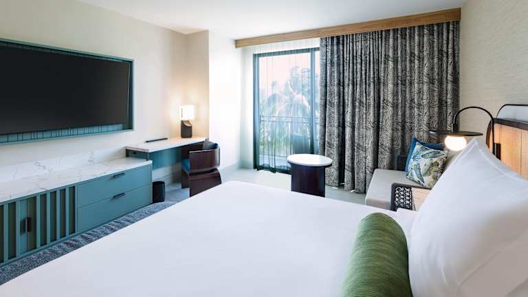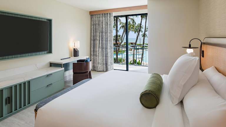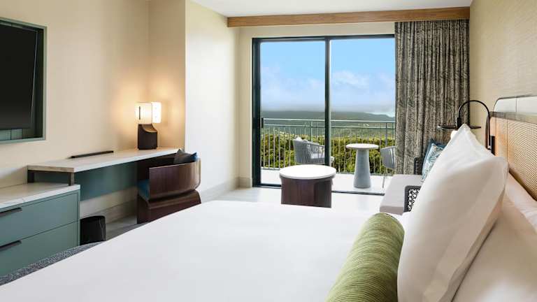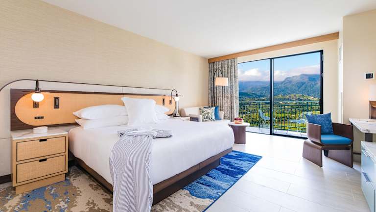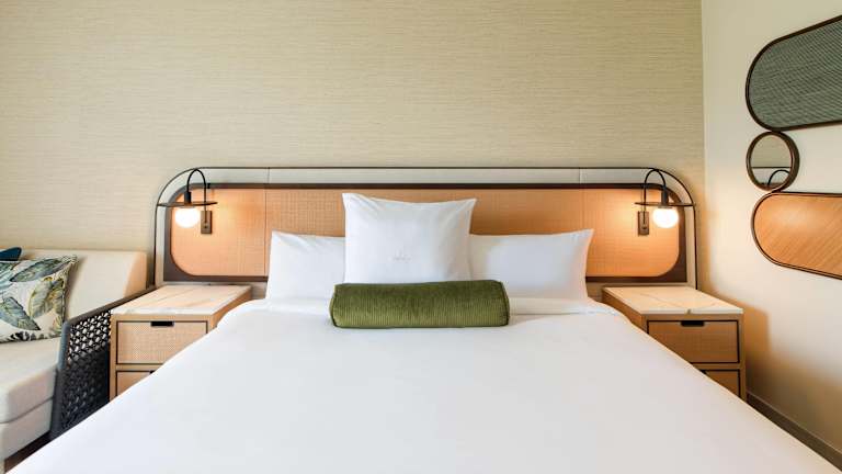 Die Zimmer sind klimatisiert und verfügen über einen Balkon, teilweise mit Meerblick. Ausgestattet sind sie mit einem Kingsizebett, einer Minibar, einem Safe und einem TV. Zusätzlich stehen ein Kühlschrank, eine Tee- und Kaffeemaschine sowie ein eigenes Badezimmer mit Dusche und Badewanne zur Verfügung. WLAN ist kostenfrei und rollstuhlgerechte Zimmer sind buchbar.