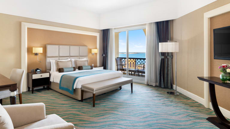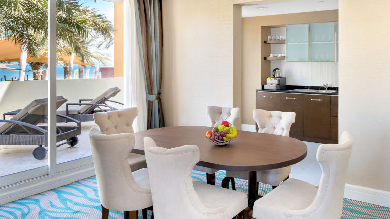 Die Deluxe Rooms haben eine Größe von 32qm bis 37qm und sind wahlweise mit einem Kingsize Bett oder Einzelbetten ausgestattet. Die geräumigen Zimmer haben außerdem eine gemütliche Sitzecke, ein Badezimmer mit Regendusche und viele weitere Annehmlichkeiten. Die meisten der 43qm bis 47qm grossen Premium Zimmer bieten einen einzigartigen Ausblick auf den Arabischen Golf. Gedankenvoll eingerichtet mit einem großzügigen Sitzbereich der einen angenehmen Aufenthalt ermöglicht. Die Family Suiten , mit einer Größe von 61qm bis 81qm, sind ausgestattet mit zwei Schlafzimmern und eigenen Bädern . Die Aufteilung der Suiten erlaubt es, Privatsphähre und Zusammensein mit der Familie zu vereinigen und ist somit ideal für Familien geeignet. Die 72qm große Junior Suite ist ausgestattet mit einem Doppelzimmer und einem Zweibettzimmer die jeweils über ein eigenes Bad verfügen . An das großzügig geschnittene Wohnzimmer grenzt neben einem privaten Balkon auch ein weiteres Badezimmer an. Die Senior Suite verfügt über ein Doppelzimmer und zwei Zweitbettzimmer mit jeweils eigenem Bad. Das komfortable Wohnzimmer und ein separates Bad machen die 107qm große Suite besonders ansprechend. Die King Suite bietet auf 190qm das Höchste an Luxus und Komfort und beeindruckt mit einem stilvollen Wohnzimmer mit angrenzendem Bad, drei luxuriösen Schlafzimmer mit separaten Bädern und einer private Terrasse mit Ausblick auf den Arabischen Golf.