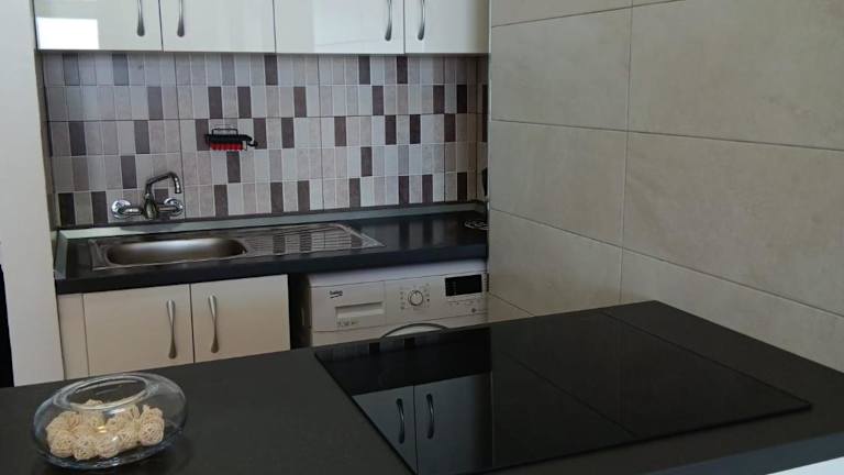 Die Ferienwohnung verfügt über eine Küche, die mit einem Kühlschrank, einem Ofen, einer Mikrowelle, einer Kaffeemaschine und einem Wasserkocher ausgestattet ist.