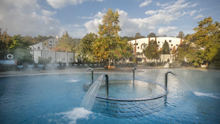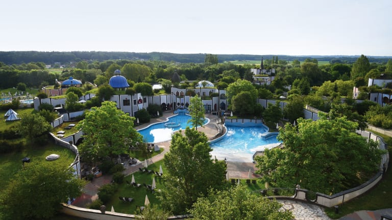 Eingebettet in die steirische Hügellanschaft liegt Rogner Bad Blumau. Bewachsene Dächer, runde Formen, bunte Fassaden und goldene Kuppeln fügen sich zu einem lebenden Gesamtkunstwerk.