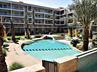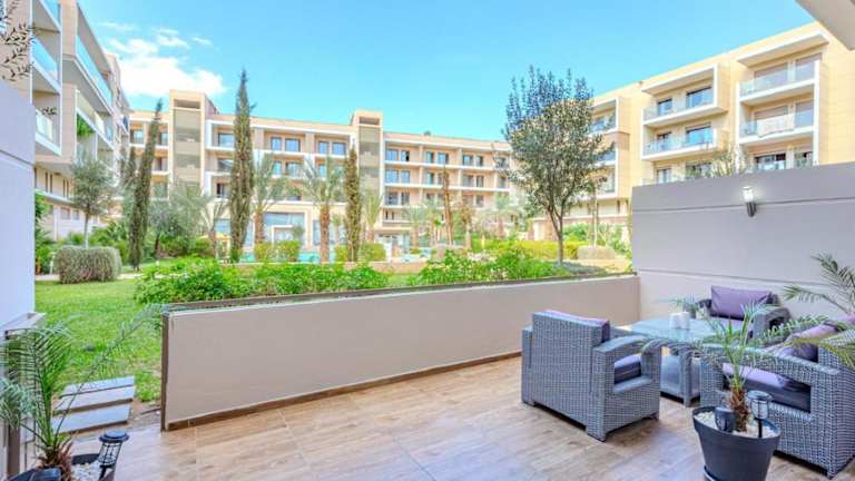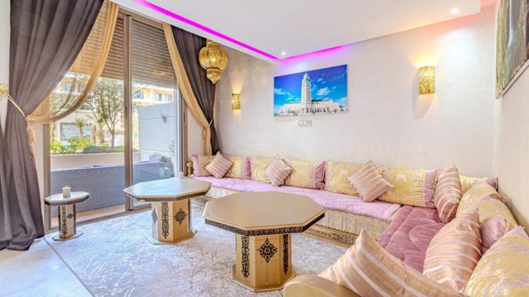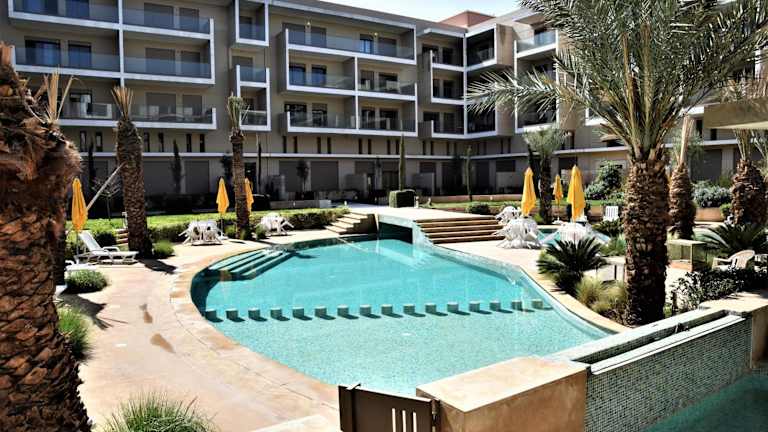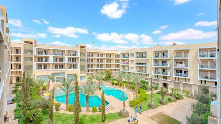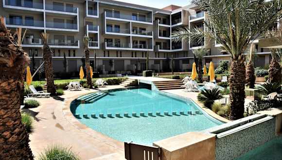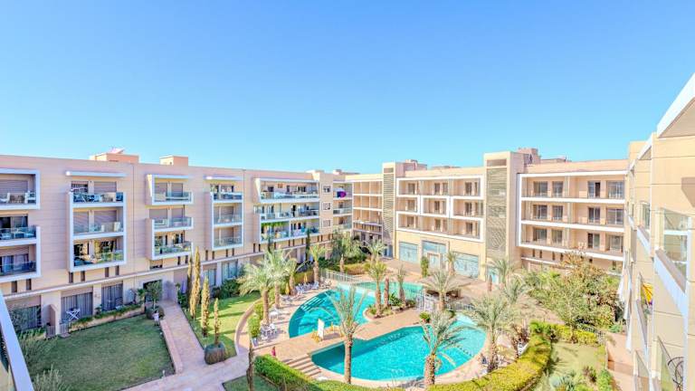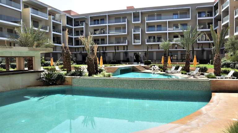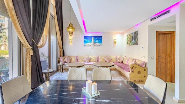 Royal Deluxe Gold - Marrakech, Luxe Pool View bietet Übernachtungsmöglichkeiten in einer komfortablen Ferienwohnung mit einem Außenpool, einem Garten und einer Terrasse. Die Unterkunft wird von einem privaten Gastgeber geführt und bietet Annehmlichkeiten wie kostenlosen WLAN-Zugang, eine 24-Stunden-Sicherheitsüberwachung und Nichtraucherzonen in allen Bereichen.