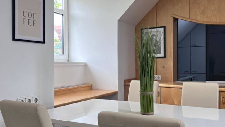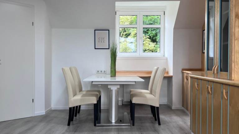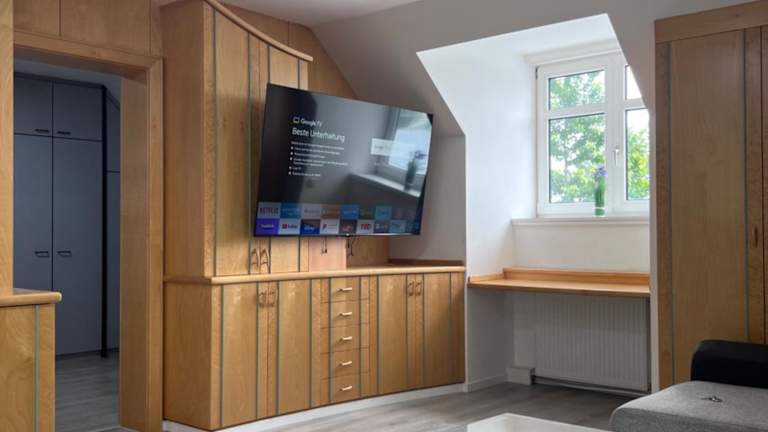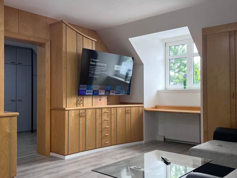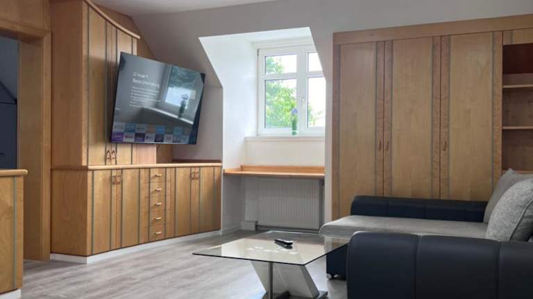 Die Ferienwohnung umfasst ein Wohnzimmer mit einem Flachbild-TV, eine voll ausgestattete Küche sowie ein Badezimmer.