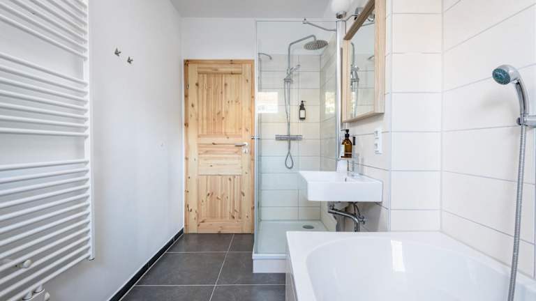 Die Ferienwohnung verfügt über eine Terrasse mit Gartenblick und umfasst zwei Schlafzimmer sowie ein Wohnzimmer. Zur Ausstattung gehören ein Flachbild-TV, eine gut ausgestattete Küche mit Kühlschrank und Geschirrspüler sowie ein Badezimmer mit Dusche. Handtücher und Bettwäsche werden bereitgestellt.
