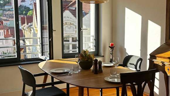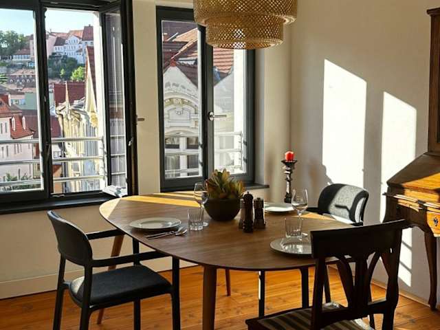 Ruhige-Moderne Wohnung mit Burgblick ist eine Ferienwohnung, die eine Terrasse und einen Blick auf die Stadt bietet. Sie ist modern und ruhig gestaltet und ideal für Aufenthalte in Meißen.