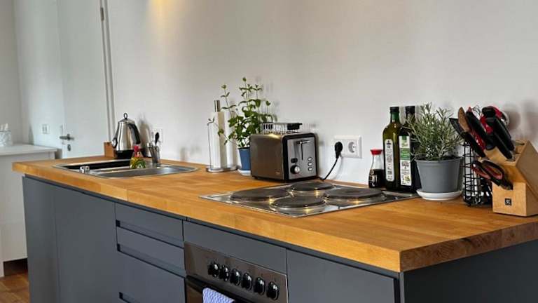 Die Unterkunft verfügt über eine voll ausgestattete Küche mit Kühlschrank und Wasserkocher, sodass die Möglichkeit besteht, eigene Mahlzeiten zuzubereiten. Restaurants oder weitere Verpflegungsmöglichkeiten sind in den bereitgestellten Informationen nicht aufgeführt.
