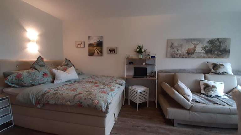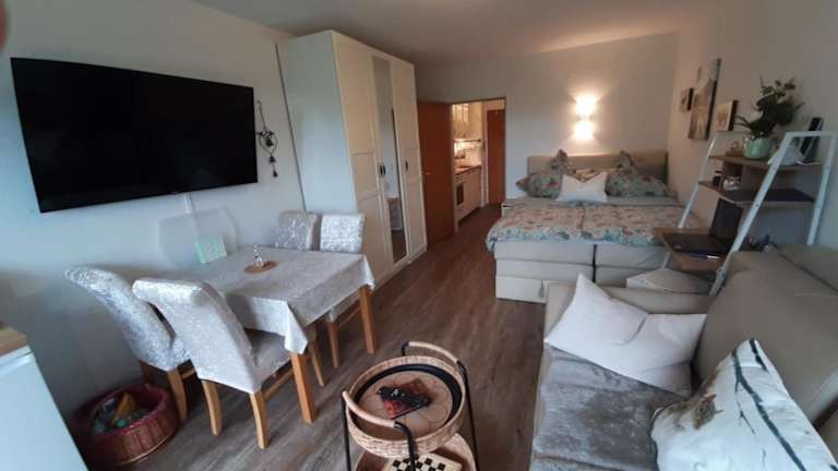 Die Ferienwohnung ist ausgestattet mit einer Küche, die einen Kühlschrank, Geschirrspüler, Ofen, Kaffeemaschine und Wasserkocher umfasst. Die Unterkunft besteht aus einem Wohnzimmer und einem Balkon, um den Aufenthalt angenehm zu gestalten.