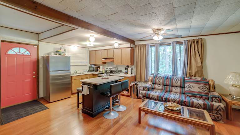 Das Cottage im Landhausstil verfügt über ein Schlafzimmer, ein Wohnzimmer und eine voll ausgestattete Küche. Das Schlafzimmer bietet Ihnen einen gemütlichen Rückzugsort, um sich nach einem ereignisreichen Tag zu erholen. Das Wohnzimmer lädt zum Entspannen ein und verfügt über bequeme Sitzgelegenheiten. Die voll ausgestattete Küche ermöglicht es Ihnen, Ihre eigenen Mahlzeiten zuzubereiten und den Komfort eines eigenen Zuhauses zu genießen. Handtücher und Bettwäsche werden gestellt, um Ihnen einen angenehmen Aufenthalt zu ermöglichen.