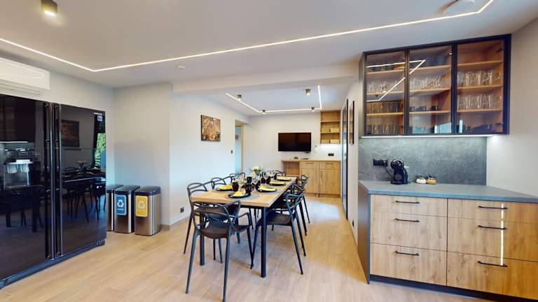 Jede Wohneinheit ist mit einer voll ausgestatteten Küche mit einem Esstisch ausgestattet, die Kühlschrank, Geschirrspüler, Ofen, Kaffeemaschine und Wasserkocher umfasst.