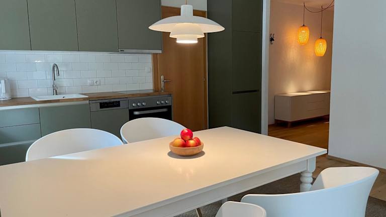 Die Ferienwohnung verfügt über 2 Schlafzimmer, ein Wohnzimmer mit Flachbild-TV sowie eine gut ausgestattete Küche mit Kühlschrank und Geschirrspüler. Das Badezimmer ist mit einer Dusche ausgestattet und Handtücher sowie Bettwäsche werden bereitgestellt.