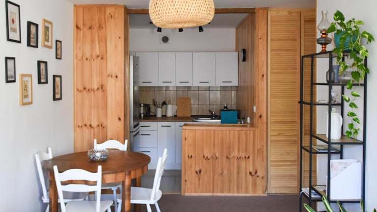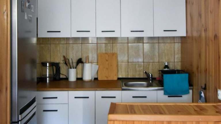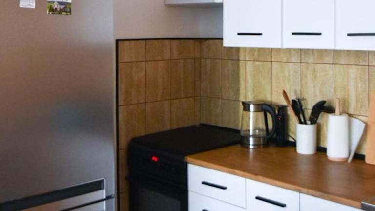 Die Ferienwohnung ist mit einer voll ausgestatteten Küche eingerichtet, die einen Kühlschrank und einen Wasserkocher beinhaltet.