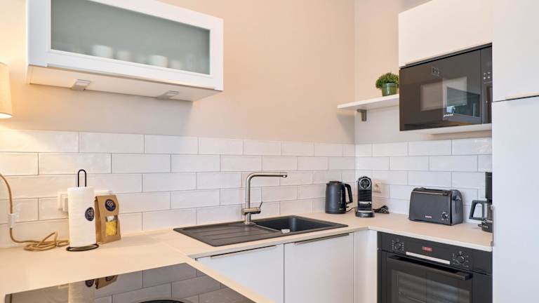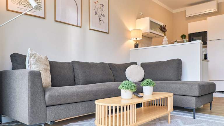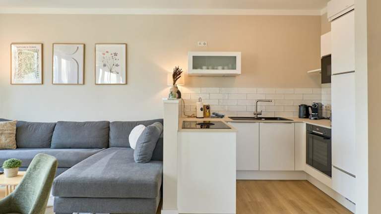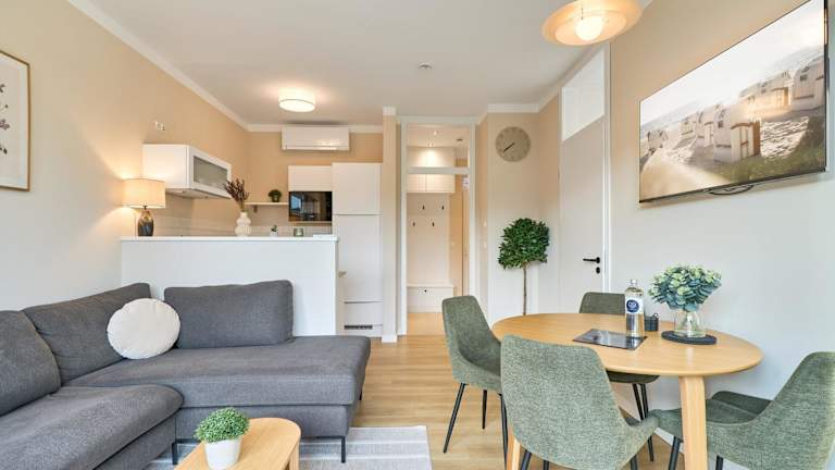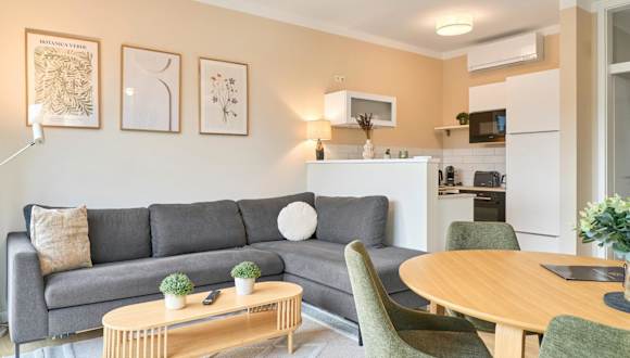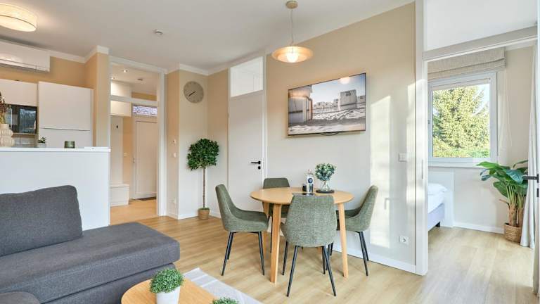 Die Ferienwohnung umfasst ein Schlafzimmer und ist ausgestattet mit Kabelfernsehen sowie einer Küche, die mit einem Kühlschrank und einem Geschirrspüler ausgestattet ist. Handtücher und Bettwäsche werden zur Verfügung gestellt. Des Weiteren bietet die Unterkunft einen kostenlosen Privatparkplatz und eine Terrasse mit Gartenmöbeln.