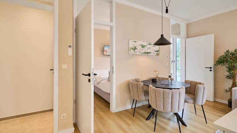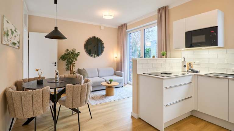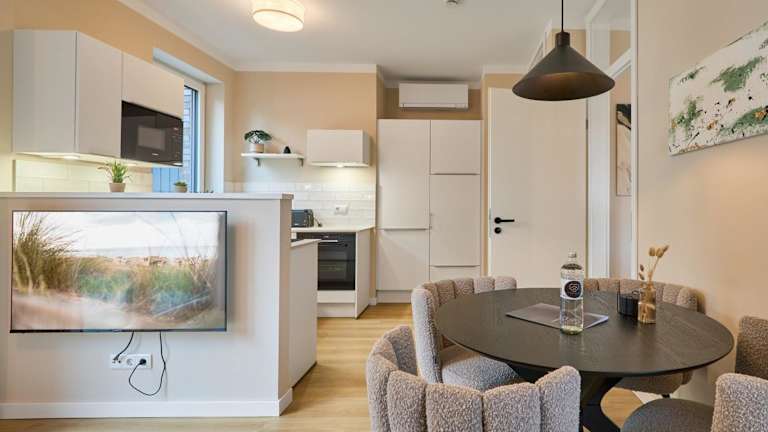 Die Ferienwohnung besteht aus einem Schlafzimmer und einem Wohnzimmer. Sie ist mit Klimaanlage ausgestattet und umfasst eine voll ausgestattete Küche mit Kühlschrank und Wasserkocher. Ein Badezimmer mit Dusche und Haartrockner sowie die Bereitstellung von Handtüchern und Bettwäsche sind ebenfalls vorhanden.