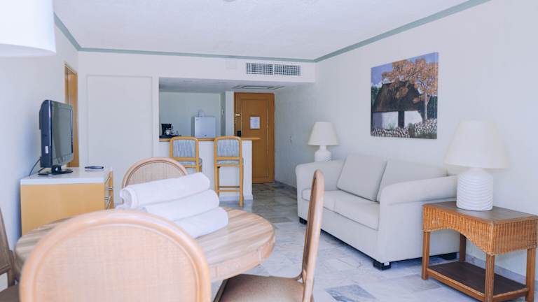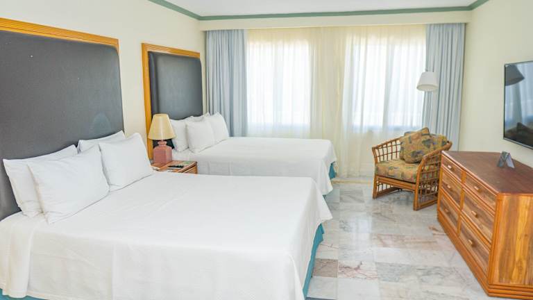 Die Zimmer sind mit Klimaanlage, Heizung, Kingsizebett und Sofabett ausgestattet. Meerblick ist von Balkon oder Terrasse möglich. Zusätzliche Annehmlichkeiten sind ein Safe, eine Minibar, ein Kühlschrank sowie eine Tee-/Kaffeemaschine. Im Badezimmer stehen Dusche, Badewanne, Haartrockner und Kosmetikartikel zur Verfügung. Es gibt sowohl rollstuhlgerechte als auch Familienzimmer.