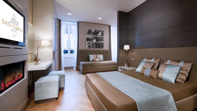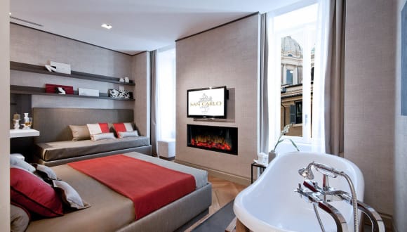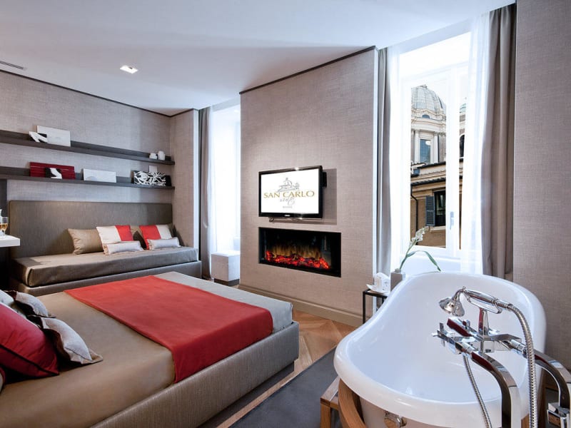 Das Exclusive Town House San Carlo Suite, Synonym für Erstklassigkeit, Prestige und Ruhe, liegt auf der zweiten Etage eines renommierten historischen Gebäudes inmitten des historischen Stadtzentrums von Ron in der Via del Corso 112, zwischen der Piazza del Popolo und der Via Condotti. Einige Fenster blicken auf die Via del Corso, von wo aus Sie die Aussicht auf die majestätische Kuppel der Kirche Chiesa di San Carlo e di San Bartolomeo genießen können, während die virtuelle Rezeption, die Bibliothek, die Bildschirme, die Informations-Touchscreens und die elektrischen Kamine ein warmes und einladendes Ambiente schaffen, das ideal für Ferien oder Geschäftsreisen ist.
