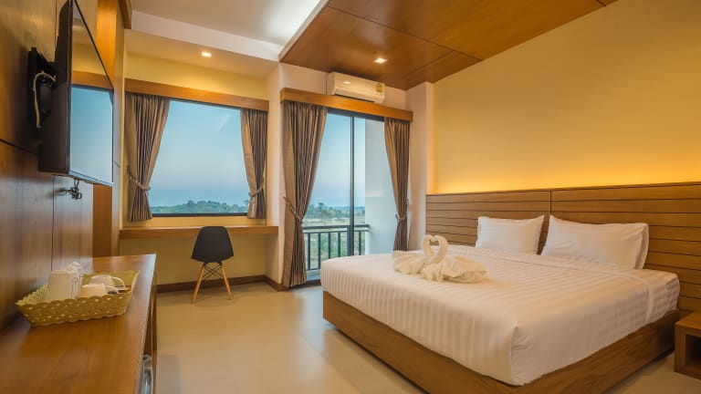Die klimatisierten Zimmer im Sann View Hotel sind komfortabel und stilvoll eingerichtet. Jedes Zimmer verfügt über einen geräumigen Kleiderschrank, einen Balkon mit herrlichem Bergblick und ein eigenes Badezimmer. Zur Ausstattung gehören auch ein Flachbild-TV, Bettwäsche und Handtücher, um den Gästen einen angenehmen Aufenthalt zu ermöglichen. Ein Kühlschrank ist ebenfalls vorhanden, um Getränke und Snacks kühl zu halten.