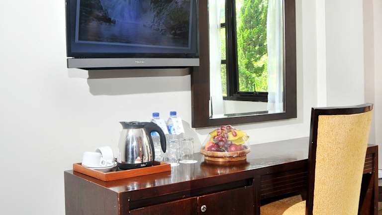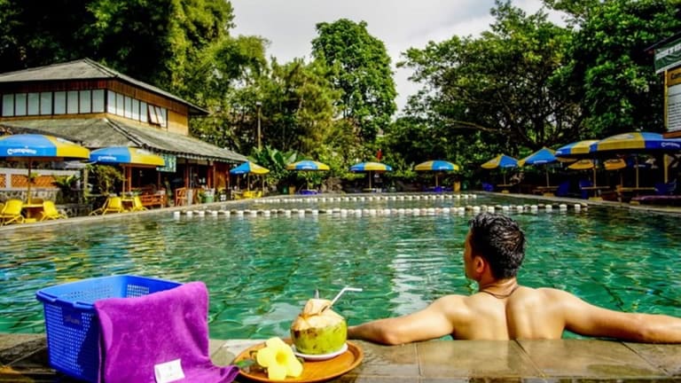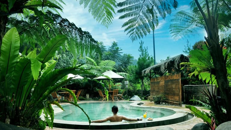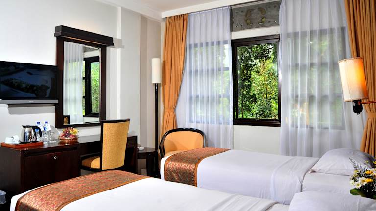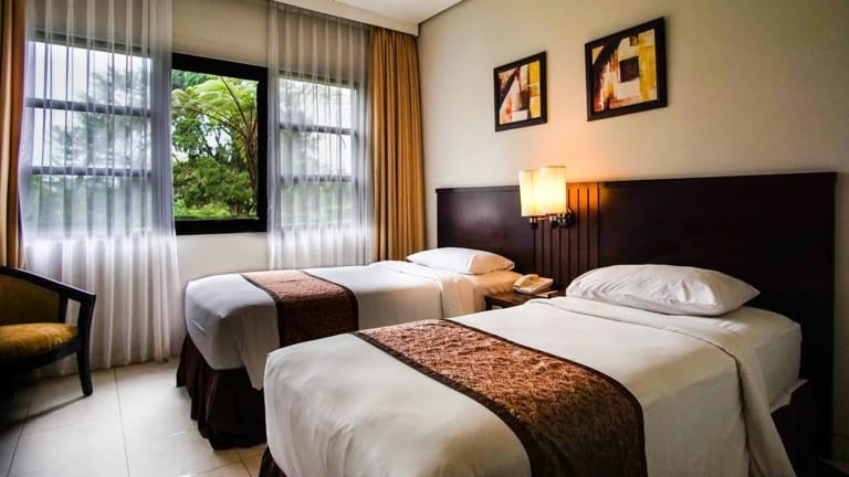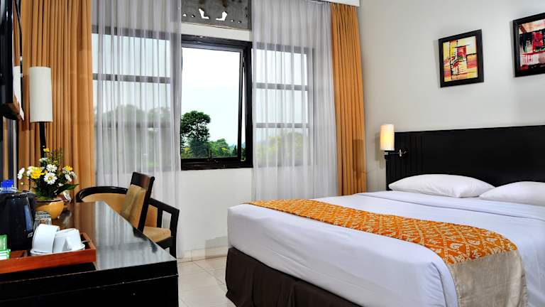 Das Sari Ater Hotel & Resort befindet sich am Hang des Vulkans Tangkuban Perahu und bietet Ihnen ein ruhiges und idyllisches Urlaubsziel. Die umliegende Landschaft lädt zu erholsamen Spaziergängen ein. Der angrenzende Erholungspark, der Hot Spring Recreation Park, bietet Ihnen freien Eintritt zu den Thermalbecken und eine Vielzahl von Freizeitaktivitäten wie Wassersport, Paintball und Reiten. Das Hotel liegt eine Autostunde vom Flughafen Bandung entfernt und bietet Ihnen kostenlose Parkplätze. Der internationale Flughafen Soekarno-Hatta ist in 3,5 Autostunden erreichbar.