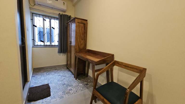 Die Zimmer im Satvik Stays Hotel sind komfortabel und bieten eine klimatisierte Umgebung, einen Balkon und einen gemütlichen Sitzbereich mit einem Fernseher. Genießen Sie Ihren Aufenthalt und entspannen Sie sich in Ihrem eigenen privaten Rückzugsort.