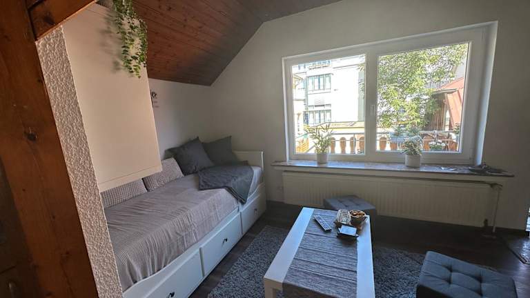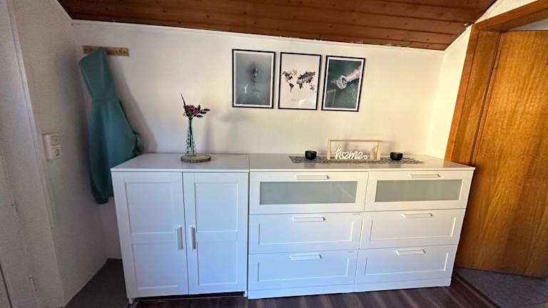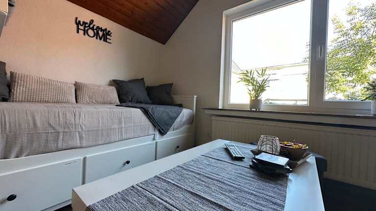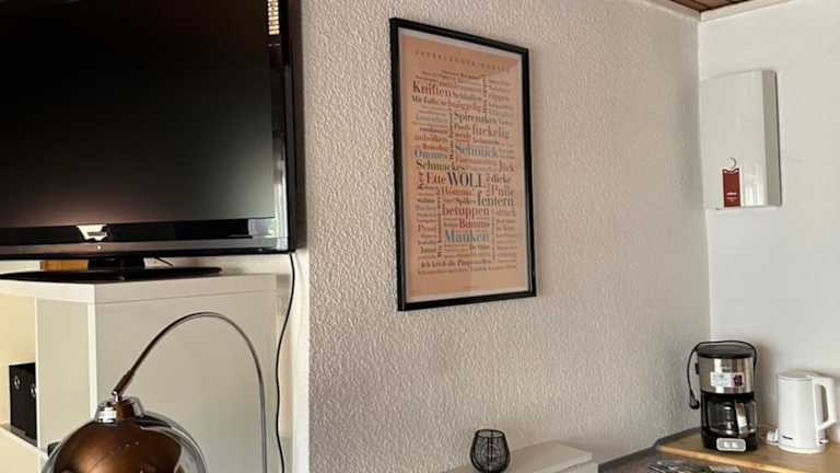 Die Ferienwohnung umfasst ein Schlafzimmer, ein Badezimmer, Bettwäsche und Handtücher. Zur Ausstattung gehören ein Flachbild-TV, eine voll ausgestattete Küche sowie ein Balkon mit Blick auf den Garten. Außerdem sind WLAN, Heizung und ein Rauchmelder vorhanden.