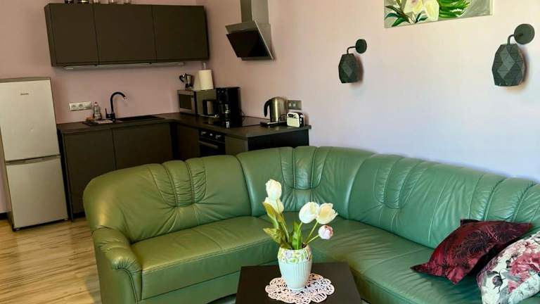 Die Ferienwohnung umfasst ein Schlafzimmer, ein Wohnzimmer sowie eine voll ausgestattete Küche mit Kühlschrank und Kaffeemaschine. Im Badezimmer sind eine Dusche sowie kostenlose Pflegeprodukte vorhanden. Handtücher und Bettwäsche werden bereitgestellt. Die Unterkunft ist gemütlich und für Nichtraucher ausgelegt.