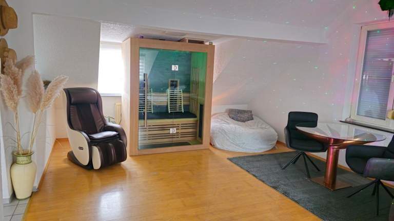 Die Unterkunft SAUNA - MASSAGE -Bodensee-Cinema Feeling- Home Sharing - Parking - Küche bietet Übernachtungsmöglichkeiten in einer Ferienwohnung. Die Ausstattung umfasst ein kostenloses WLAN und einen Flat-TV. Zur Verfügung stehen Spa- und Wellnesseinrichtungen, einschließlich einer Sauna und Massageanwendungen auf Anfrage.