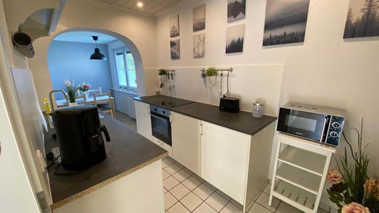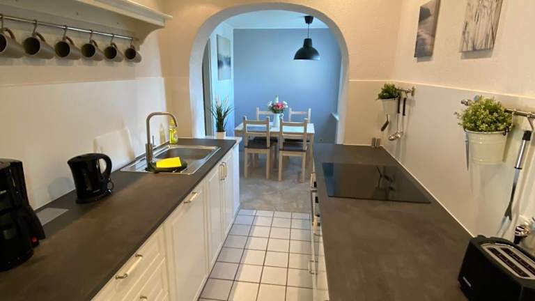 Das Ferienhaus umfasst 2 Schlafzimmer, eine voll ausgestattete Küche mit Kühlschrank und Geschirrspüler sowie ein Badezimmer mit Dusche und Haartrockner. Ein Flachbild-TV ist ebenfalls vorhanden.