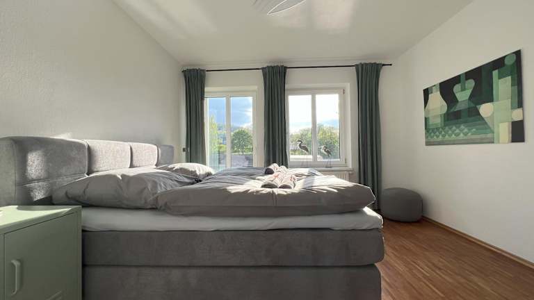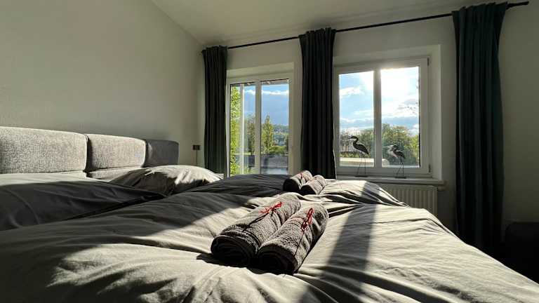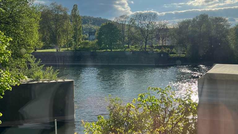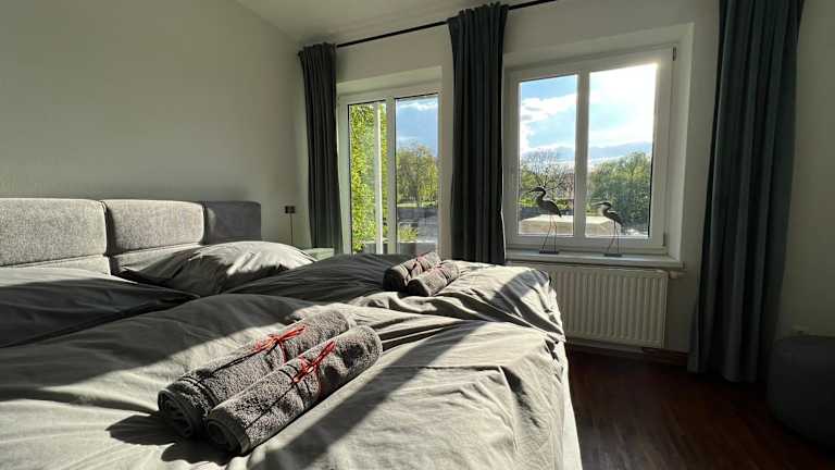 Die Ferienwohnung verfügt über ein Schlafzimmer, ein Badezimmer, Bettwäsche und Handtücher. Zur Ausstattung gehören ein Flachbild-TV, ein Essbereich, eine voll ausgestattete Küchenzeile und eine Terrasse mit Blick auf den Fluss.