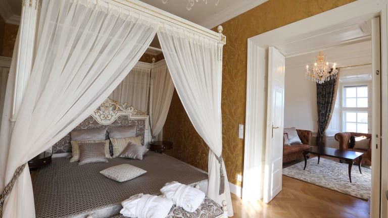 Wenn sich die Pforten der Schloss Schönbrunn Grand Suite öffnen, nimmt der imperiale Charme der Kaiserzeit all ihre Gäste in Empfang. Im imperialen Ambiente können Gäste auf großzügigen 167 m² wie ein Kaiser dinieren und sich wie eine Prinzessin betten. Die exklusive Suite der Austria Trend Hotels ist eine Kombination aus Luxusunterkunft und exklusiver Lage. Sie bietet alles, was das Herz von Royalfans zum Pulsieren bringt. Die Gemächer des ungewöhnlichen Hotelzimmers erstrecken sich über 167 Quadratmeter im Osttrakt der einstigen Sommerresidenz des Kaiserhauses. Es gibt zwei Schlafzimmer, zwei moderne Bäder, einen großzügigen Wohnraum, ein Esszimmer und eine Küche – barock-imperiales Design trifft auf moderne Komforttechnik. Die Ausstattung ist sehr nobel und das Interieur im imperialen Stil und möglichst originalgetreu gehalten, inklusive romantischem Himmelbett und geschmackvollen Stuckarbeiten. Gut zu sehen ist dies auch an der seit den 1830er Jahren am Wiener Hof verbindlich gewordenen Spielart des Neorokoko, die auch als „maria-theresianischer“ Stil bezeichnet wird. Auf dieses harmonische Farbenspiel wurde auch bei der Einrichtung der neuen Suite Bezug genommen: Farblich dominieren Schwarz, Weiß und Gold. Fixer Bestandteil der Suite ist auch der berühmte Hofdamast, ebenfalls bekannt als „Ananasdamast“ – ein traditioneller roter Seidenstoff, benannt nach dem charakteristischen Hauptmotiv einer stilisierten Ananasfrucht, der ausschließlich am Wiener Hof Verwendung fand. Der Master´s Bedroom ist in Weiß- und Goldtönen gehalten und mit einem baldachinüberdachten, mit Schnitzereien verzierten und von einer edlen Gold-Tapezierung mit schimmernden Steinchen umgebenen Himmelbett ausgestattet. Von diesem aus kann man einen direkten Blick auf die Gloriette genießen. Aber auch das zweite Schlafzimmer ist nicht minder luxuriös, wirkt durch sein rot-schwarzes Design jedoch etwas moderner. Es ist mit einem prunkvoll schwarzen Bett mit Goldumrandungen, lederbezogenem Schreibtisch und gold-patinierter Kommode ausgestattet. Ein mit Moire-Tapeten bespannter und reichlich stuckverzierter Flur verbindet die beiden Schlafgemächer. Eine in schwarz und weiß gehaltene Kitchenette bietet eine mit moderner Technik ausgestattete Kochmöglichkeit. Getafelt wird im Salon auf mit Ananasdamast bespannten Stühlen mit traditioneller weißer Lackierung und Goldapplikationen – in Anlehnung an das Schönbrunner Rösselzimmer. In den zwei großzügigen und modernen Luxusbädern lädt eine in schwarzem Klavierlack eingelassene Sitzbadewanne zum Entspannen ein.