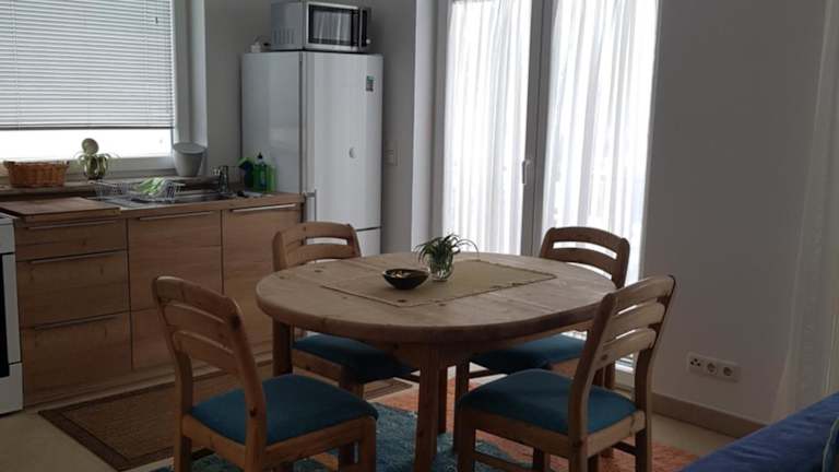 Die schöne Wohnung bietet ein gemütliches Schlafzimmer, in dem Sie sich nach einem ereignisreichen Tag ausruhen können. Entspannen Sie sich vor dem Flachbild-Sat-TV oder nutzen Sie die voll ausgestattete Küche, um Ihre Lieblingsgerichte zuzubereiten. Ein Kühlschrank, eine Mikrowelle und eine Waschmaschine stehen Ihnen zur Verfügung. Das Badezimmer ist mit einer Dusche ausgestattet und Handtücher sowie Bettwäsche werden gestellt.