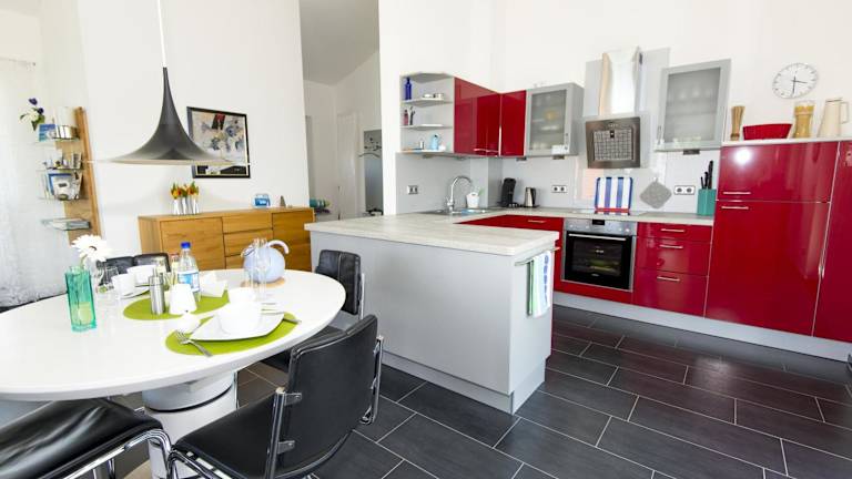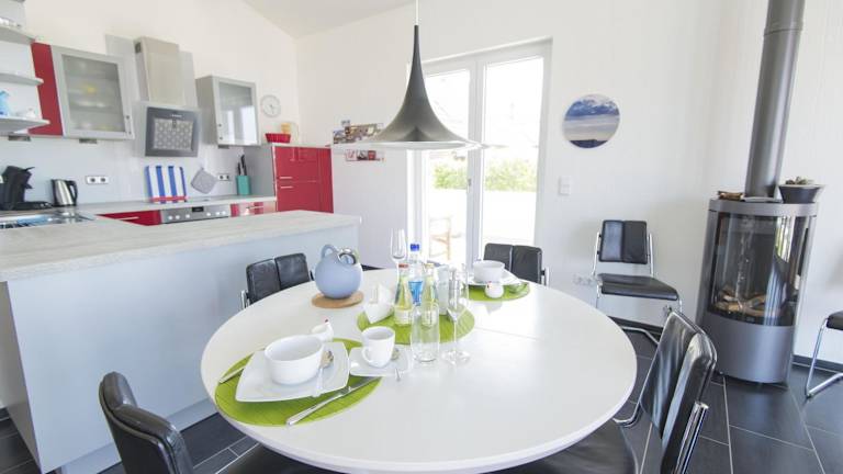 Die Unterkunft verfügt über eine gut ausgestattete Küche mit Kühlschrank, Geschirrspüler und Ofen, die eine Selbstverpflegung ermöglicht. Lebensmittelversorgung oder Restaurantdienste sind nicht angegeben.