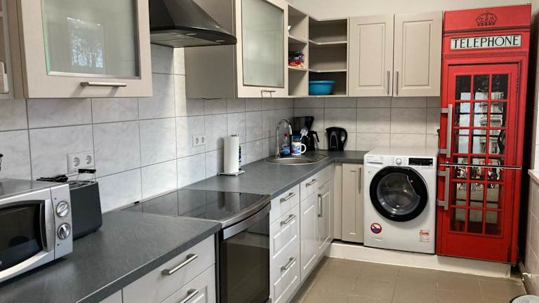Die Zimmer sind mit einer voll ausgestatteten Küche ausgestattet, die über einen Ofen, eine Mikrowelle, eine Kaffeemaschine, eine Herdplatte und einen Wasserkocher verfügt.