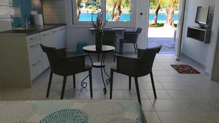 Das Sea Front Studio - Porto Boufalo - Evia bietet eine voll ausgestattete Küchenzeile, in der Sie Ihre eigenen Mahlzeiten zubereiten können. In der Umgebung finden Sie auch Restaurants, in denen Sie lokale Spezialitäten genießen können.