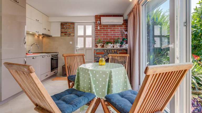 Die Sonnenterrasse des Sea Oasis Apartments - Milosevic ist der perfekte Ort, um sich zu entspannen und die Sonne zu genießen. Mit Palmen und verschiedenen Arten von Kakteen ausgestattet, bietet die Terrasse Sonnenliegen und Grillmöglichkeiten. Verbringen Sie angenehme Stunden im Freien und lassen Sie den Alltag hinter sich.