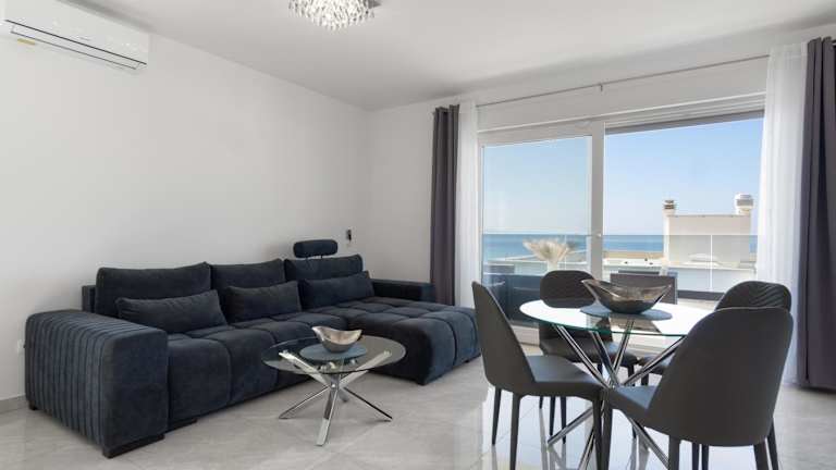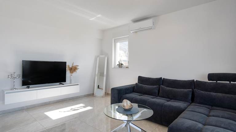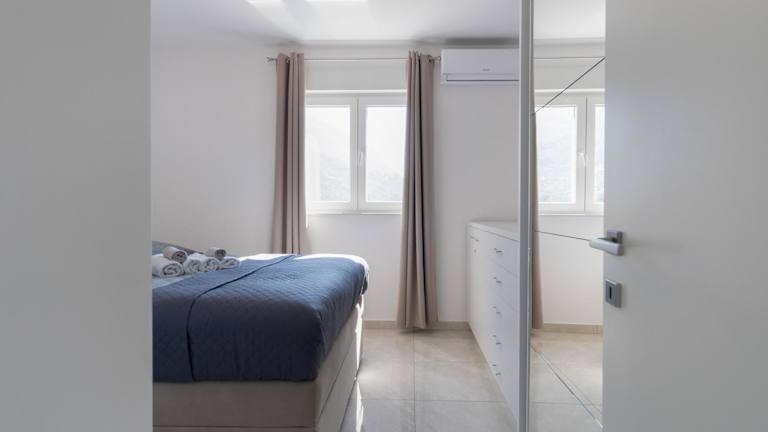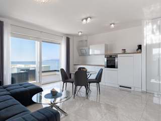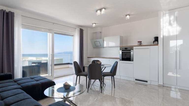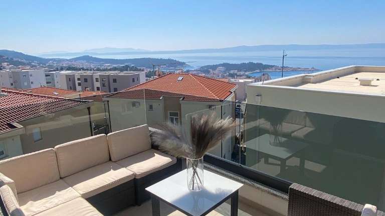 Die Unterkunft Sea View Apartment with parking - Dina bietet Übernachtungsmöglichkeiten mit Blick auf die Stadt und das Meer. Kostenloses WLAN und ein eigener Parkplatz sind ebenfalls vorhanden. Die Wohnung ist klimatisiert und verfügt über einen Balkon.