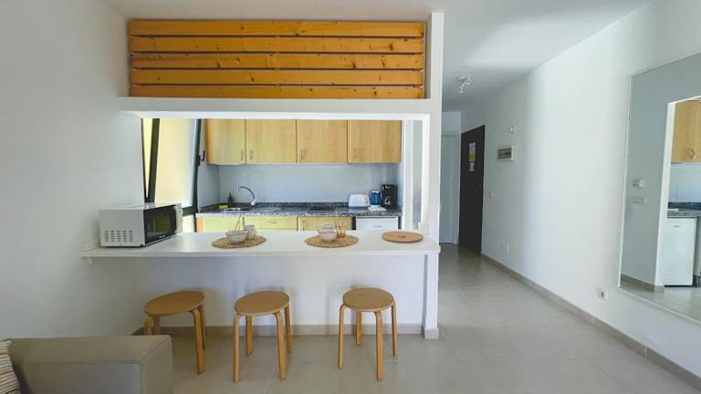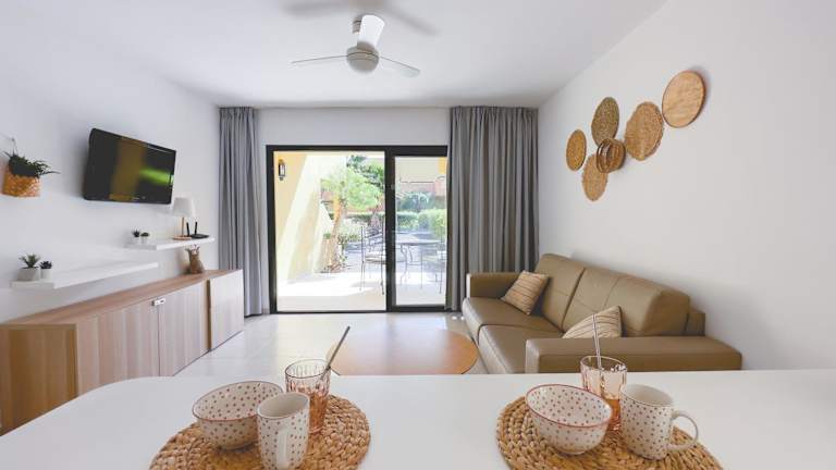 Die Ferienwohnung umfasst ein Schlafzimmer, ein Wohnzimmer mit einem Flachbild-TV, eine gut ausgestattete Küche mit Kühlschrank und Mikrowelle sowie ein Badezimmer mit Dusche. Handtücher und Bettwäsche werden bereitgestellt. Der Wohnbereich bietet Zugang zur Terrasse mit Poolblick.
