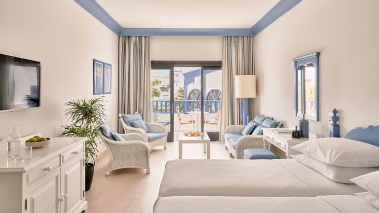 Die insgesamt 528 modernen Zimmer und Suiten bieten höchsten Wohnkomfort in einer traumhaften Umgebung. Alle Zimmer bieten ein geräumiges Badezimmer mit WC, entweder mit begehbarer Dusche oder Badewanne (Badewannen sind in Standard-, Superior- und Familienzimmern sowie in einigen Junior-Suiten verfügbar). Zur Ausstattung gehören Bademäntel, Haartrockner und Kosmetikspiegel, Klimaanlage, Minibar, Telefon, 55-Zoll-Smart-TV, Safe, Tee- und Kaffeezubereitungsmöglichkeiten, USB-C-Anschlüsse und britische Steckdosen. Alle Zimmertypen verfügen über einen privaten Balkon oder Terrasse.