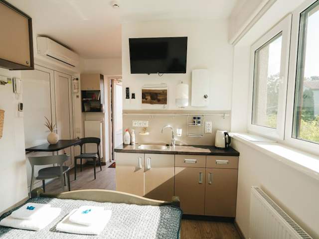 Das klimatisierte Apartment verfügt über ein Schlafzimmer, ein gemütliches Wohnzimmer und eine voll ausgestattete Küchenzeile mit Kühlschrank und Kaffeemaschine. Im Badezimmer finden Sie ein Bidet und eine Dusche. Handtücher und Bettwäsche werden gestellt, so dass Sie sich um nichts kümmern müssen.