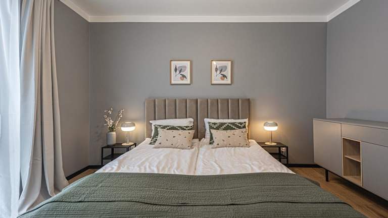 Die Ferienwohnung verfügt über zwei Schlafzimmer, ein Wohnzimmer mit Flachbild-TV, und eine gut ausgestattete Küchenzeile mit Kühlschrank und Geschirrspüler. Weiterhin gibt es ein Badezimmer mit Dusche. Handtücher und Bettwäsche werden bereitgestellt, und die Unterkunft ist rollstuhlgerecht ausgestattet.