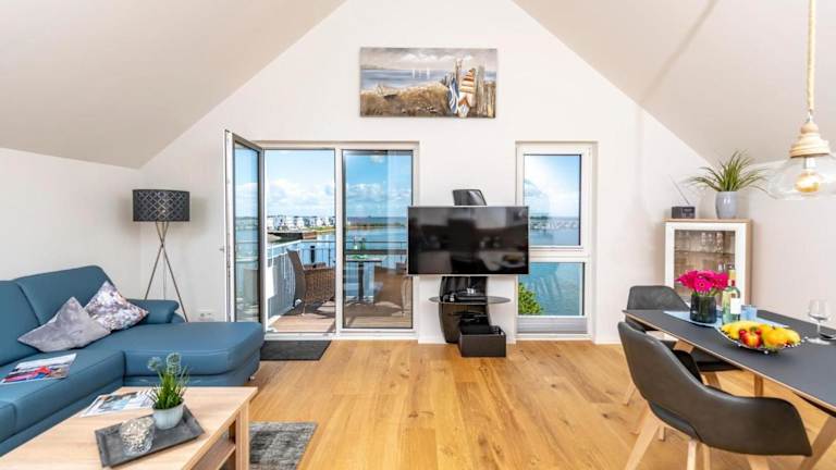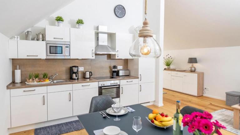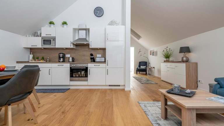 Die Ferienwohnung umfasst ein Schlafzimmer, ein Wohnzimmer sowie eine gut ausgestattete Küche mit Kühlschrank und Geschirrspüler. Des Weiteren ist ein TV vorhanden.