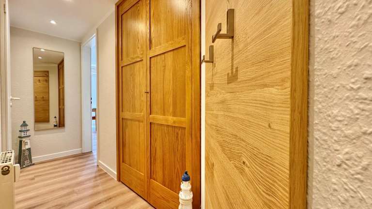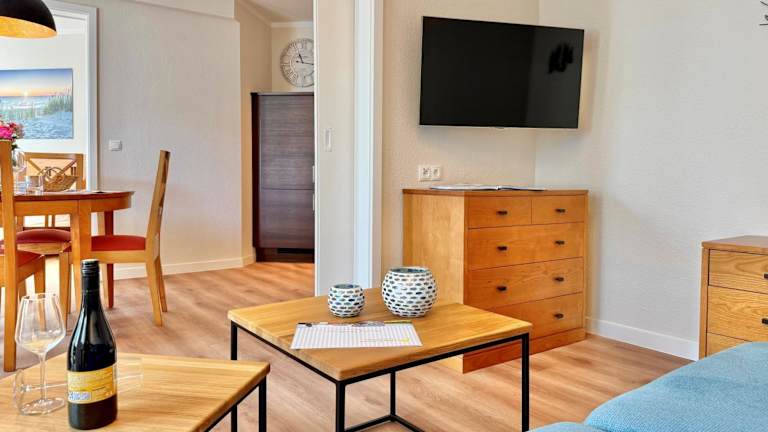 Die Ferienwohnung besteht aus einem Schlafzimmer, einem Wohnzimmer, einer voll ausgestatteten Küchenzeile mit Kühlschrank und Kaffeemaschine sowie einem Badezimmer mit Dusche. Ein Fernseher ist ebenfalls vorhanden.