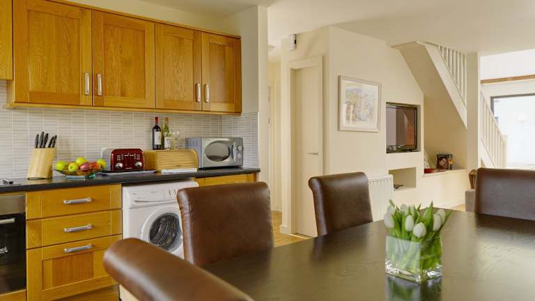 Die Ferienunterkunft ist mit einer voll ausgestatteten Küchenzeile ausgestattet, die einen Geschirrspüler und einen Ofen umfasst.