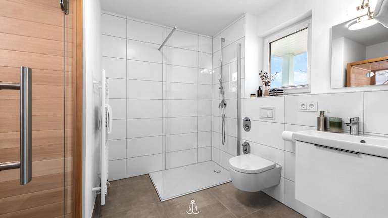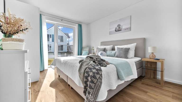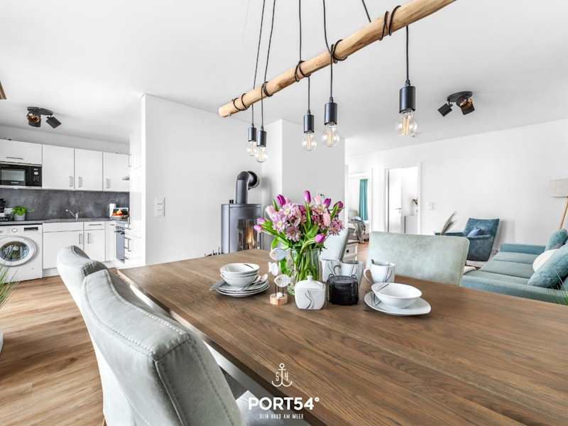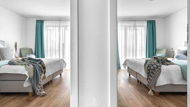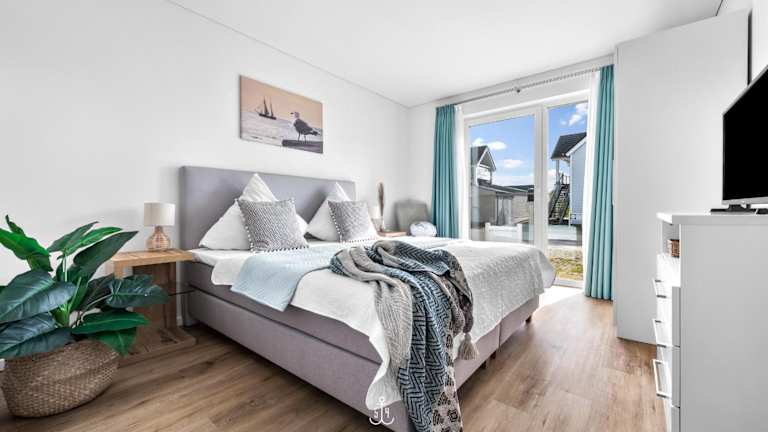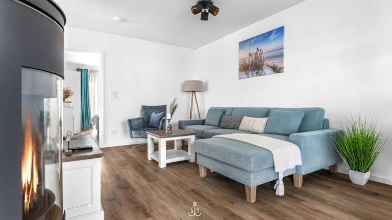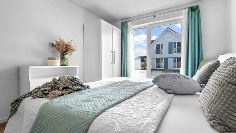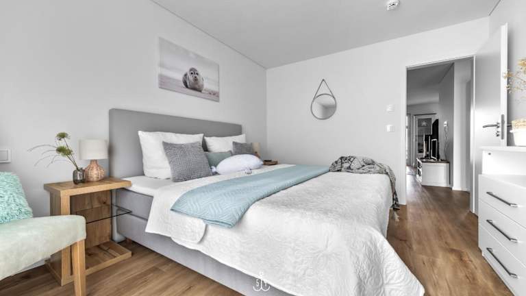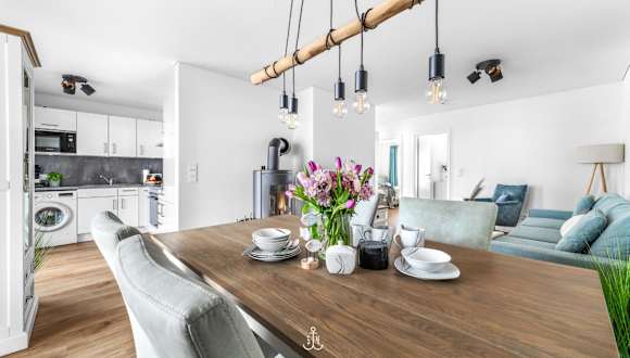 Die Ferienwohnung im Erdgeschoss bietet zwei Schlafzimmer. Zur Ausstattung gehören ein TV sowie eine voll ausgestattete Küche mit Kühlschrank, Geschirrspüler, Waschmaschine, Ofen und Mikrowelle.