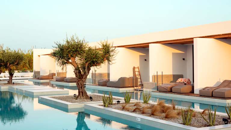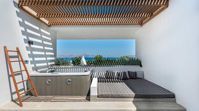 Das Hotel bietet 96 Doppelzimmer und Juniorsuiten. Alle Zimmer mit möbliertem Balkon oder Terrasse Moderne Einrichtung in hellen Erdtönen, Weiß und Blau Einige Zimmer bieten einen Whirlpool oder einen direkten Meerblick