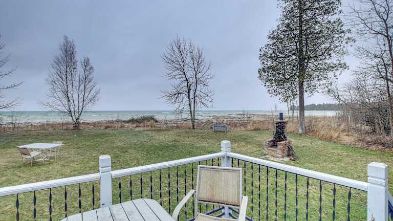 Serene Lakefront Baileys Harbor Home with Deck! ist eine Unterkunft mit einem Spa- und Wellnesscenter und Blick auf den See. Es handelt sich um ein Ferienhaus, das über ein Wohnzimmer sowie eine voll ausgestattete Küche verfügt, die mit Kühlschrank und Ofen ausgestattet ist.